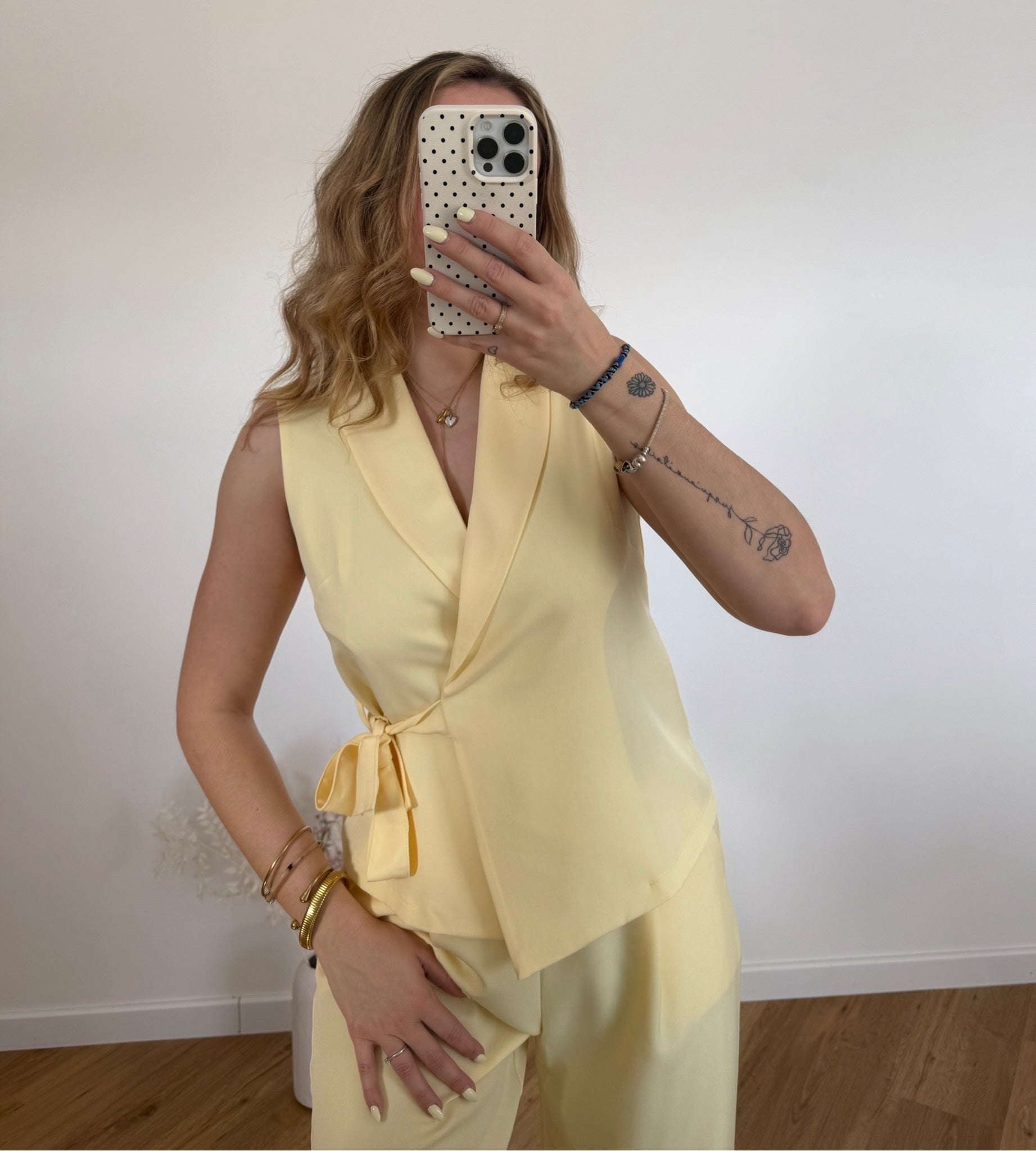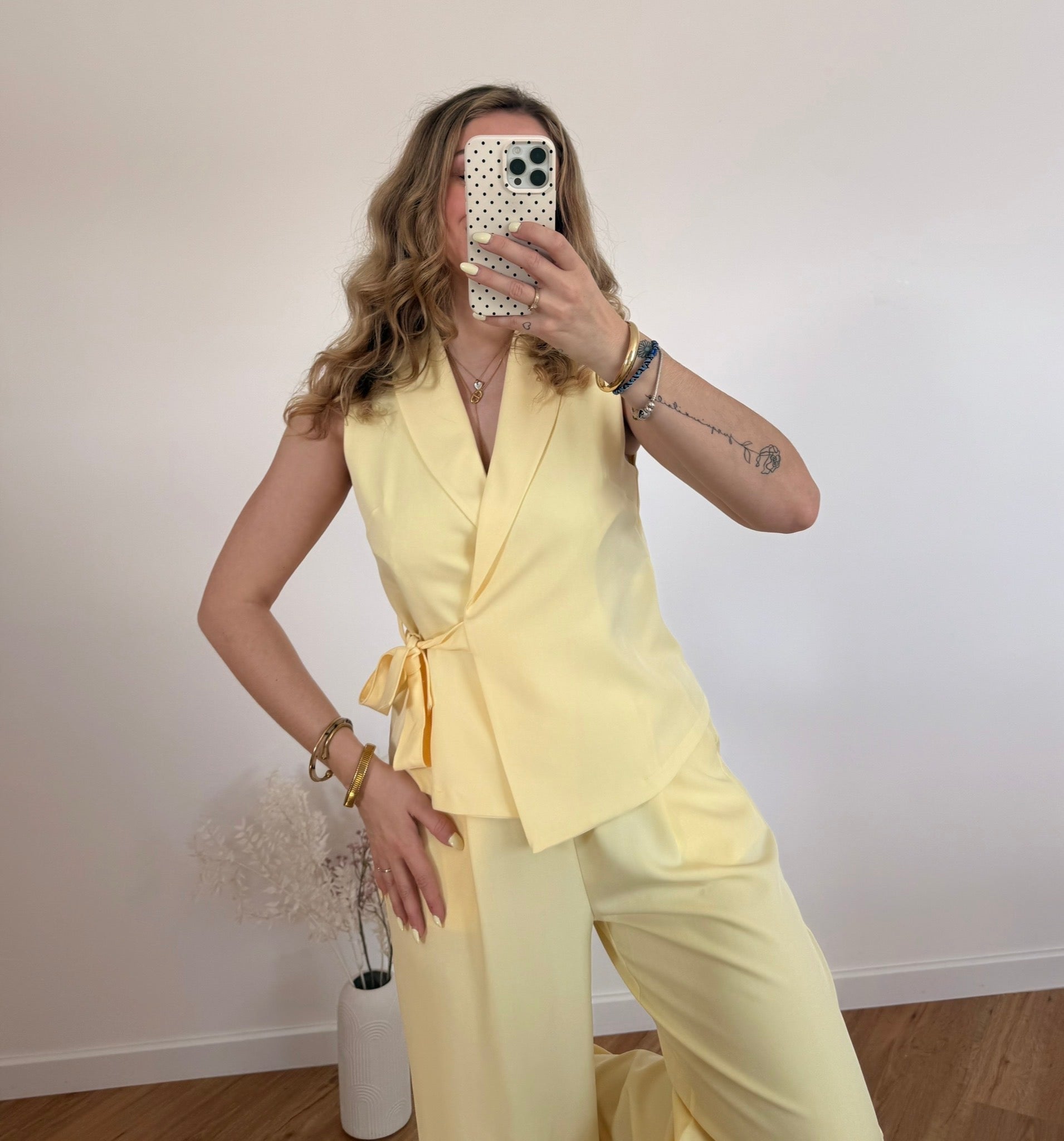 Composé d’un top sans manches à nouer et d’un pantalon large, cet ensemble allie confort et féminité avec une coupe flatteuse qui sublime toutes les silhouettes.