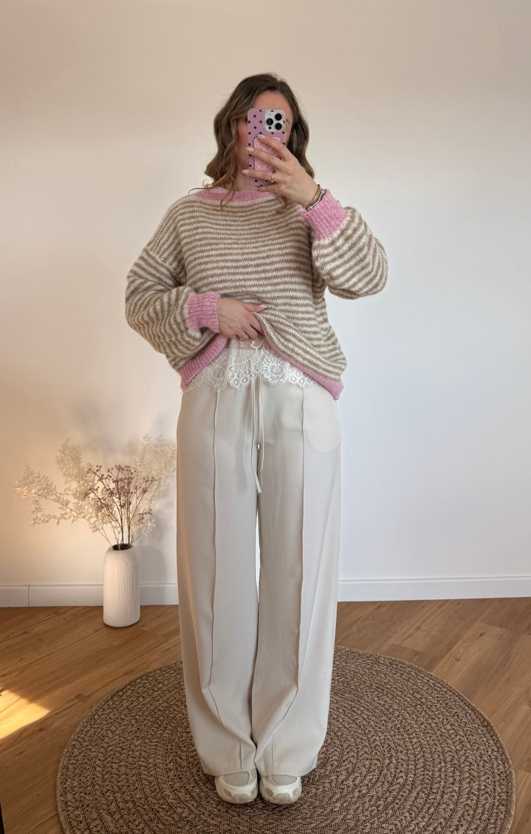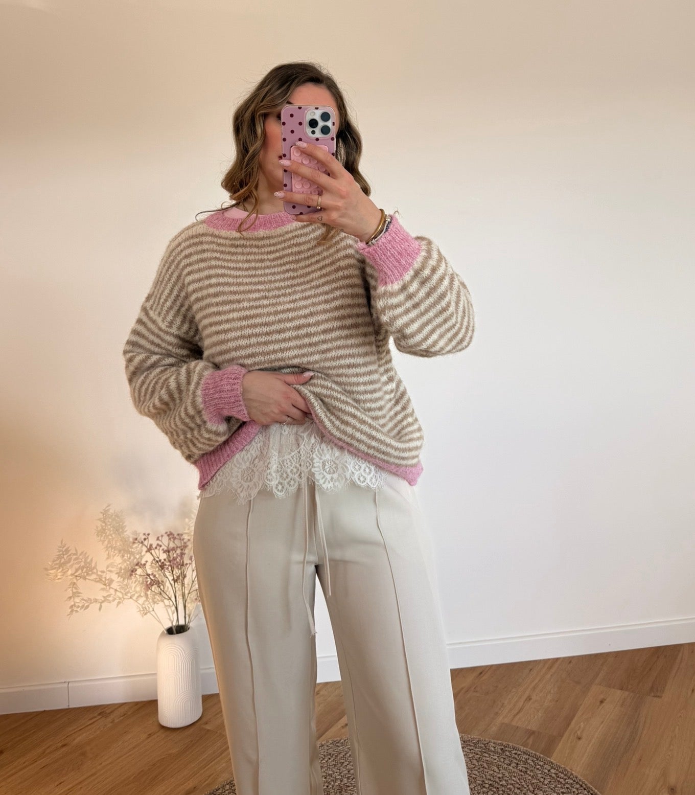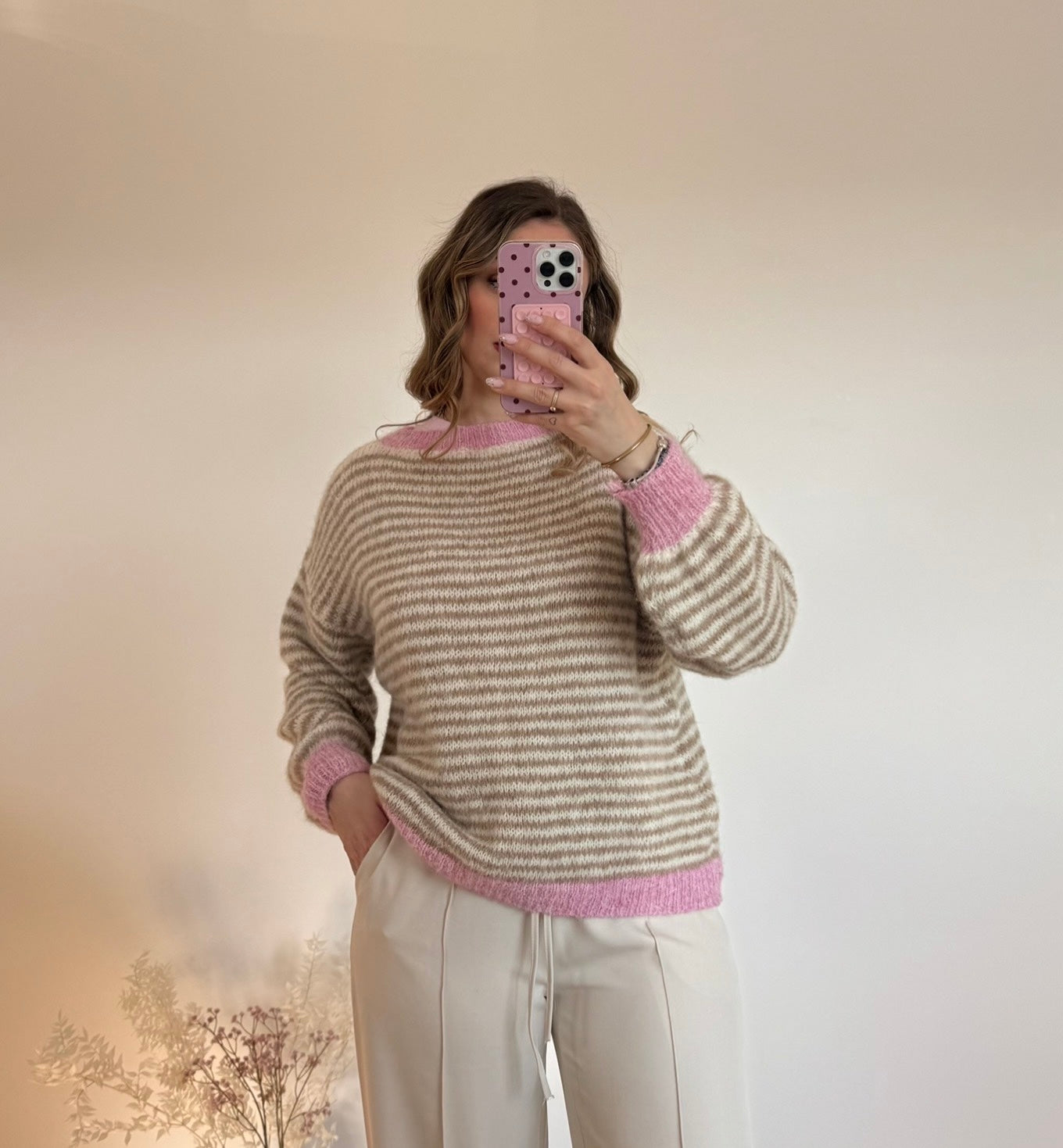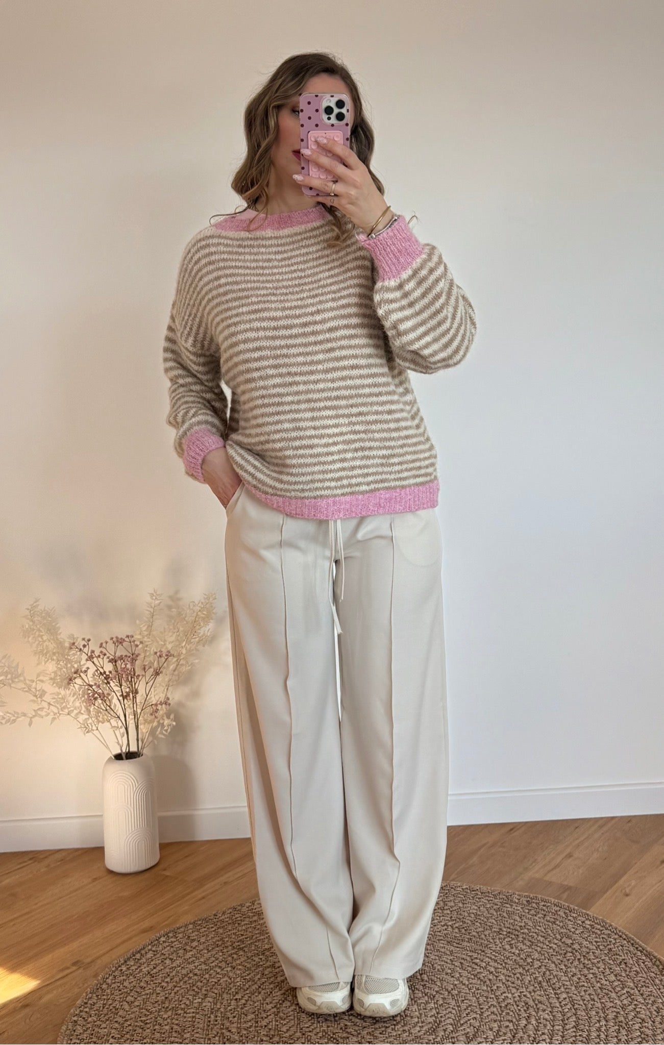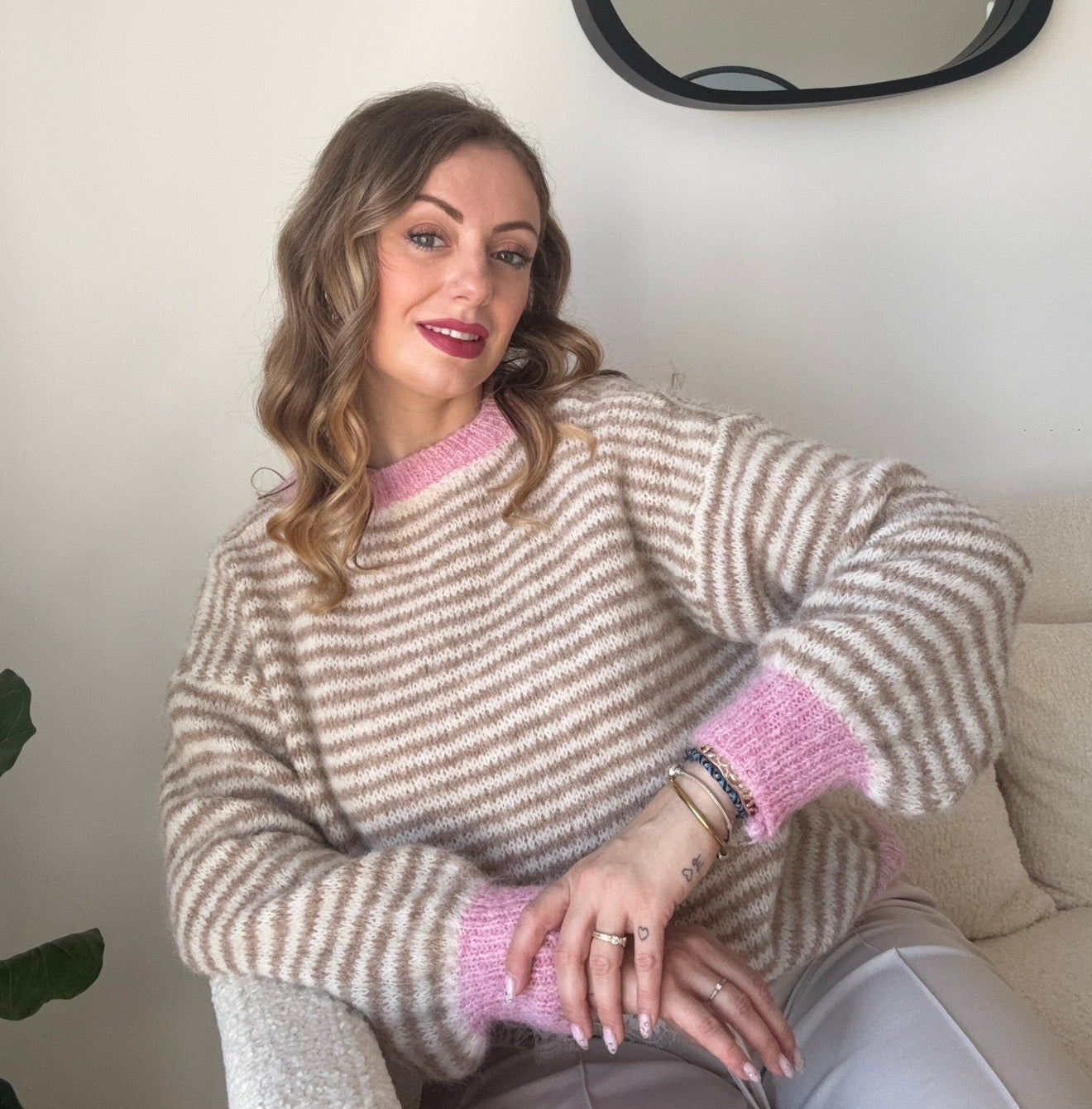 Un pull tout doux aux rayures délicates, sublimé par une touche de rose pour une allure cosy et féminine.